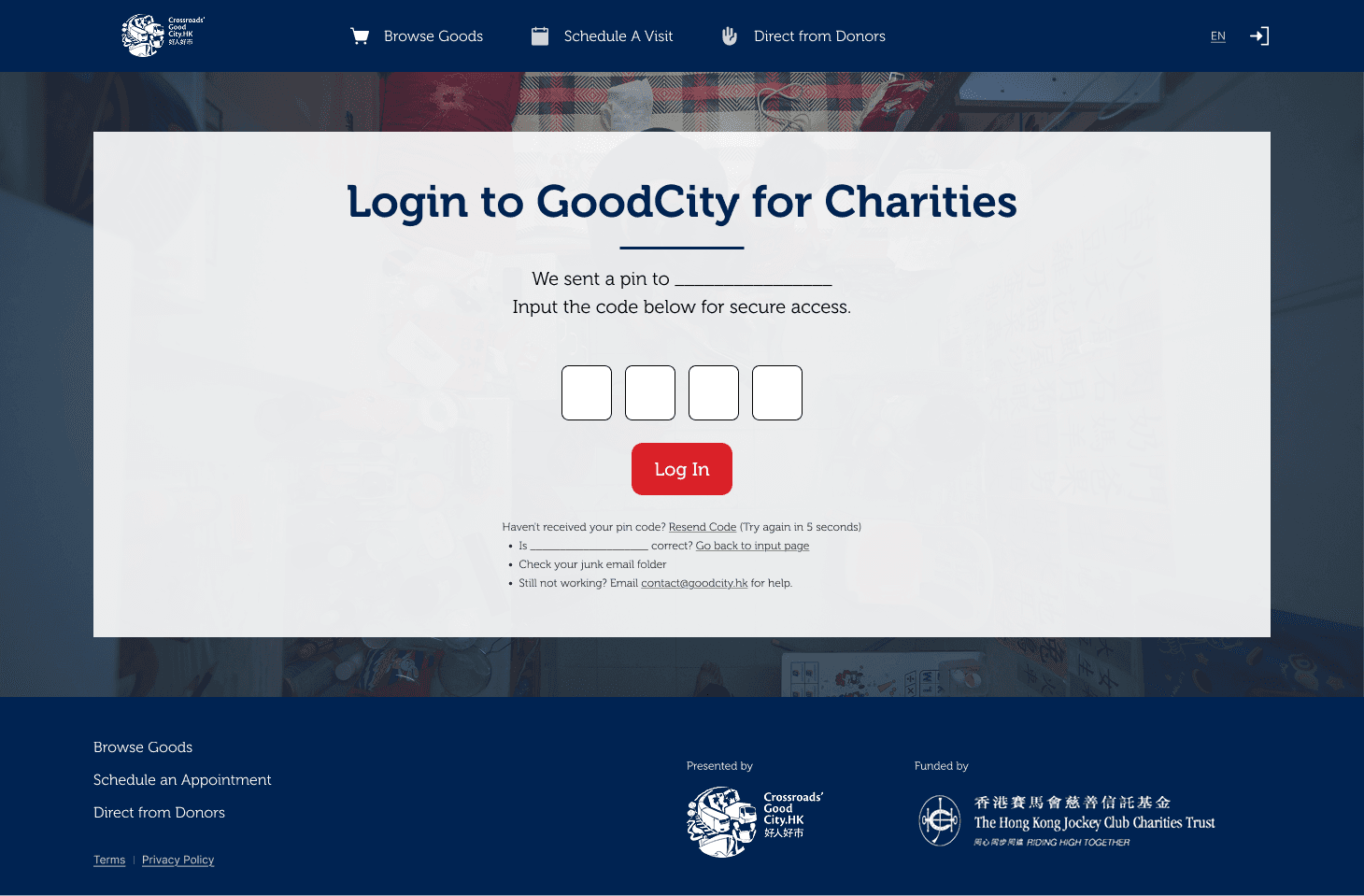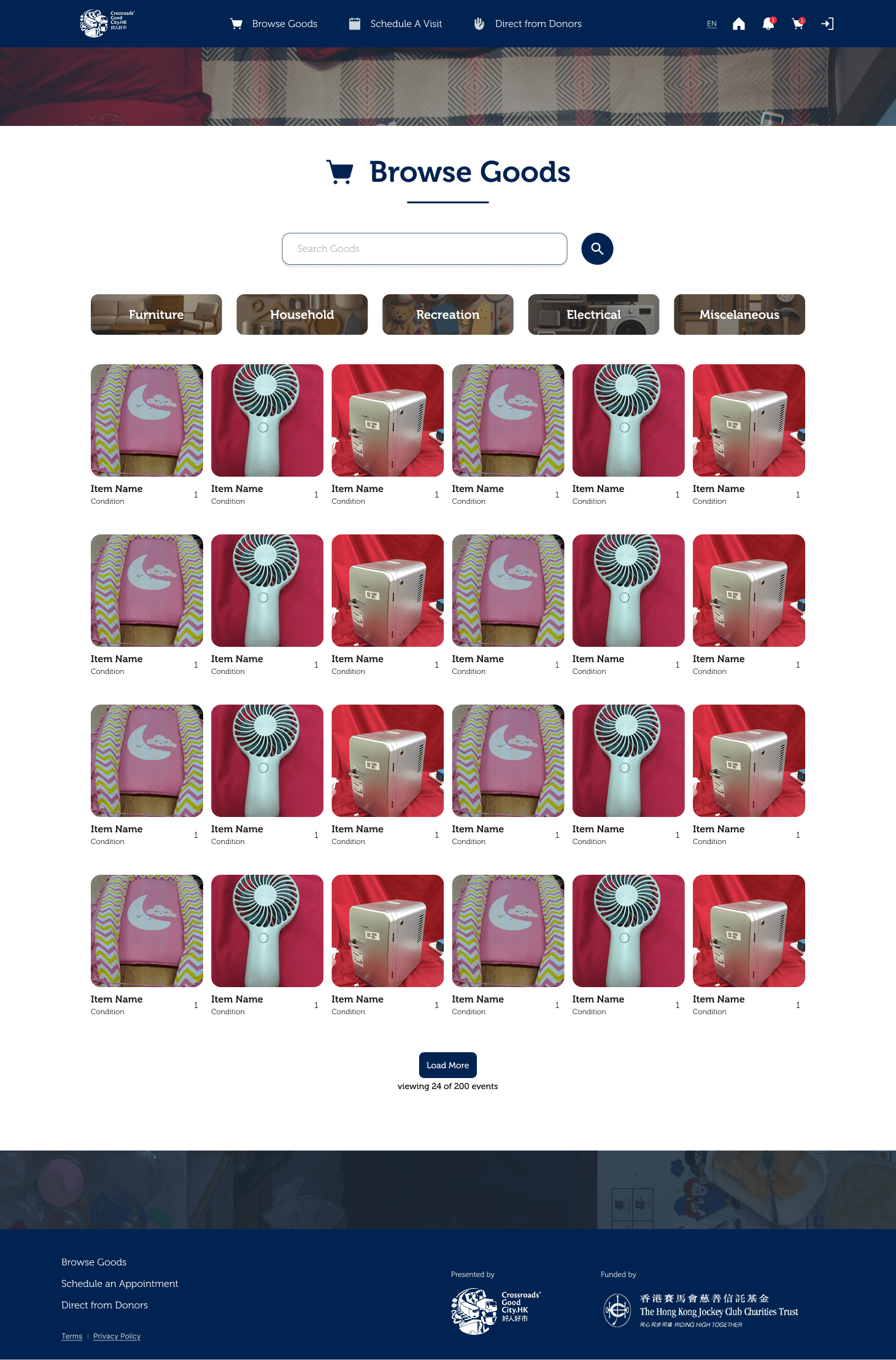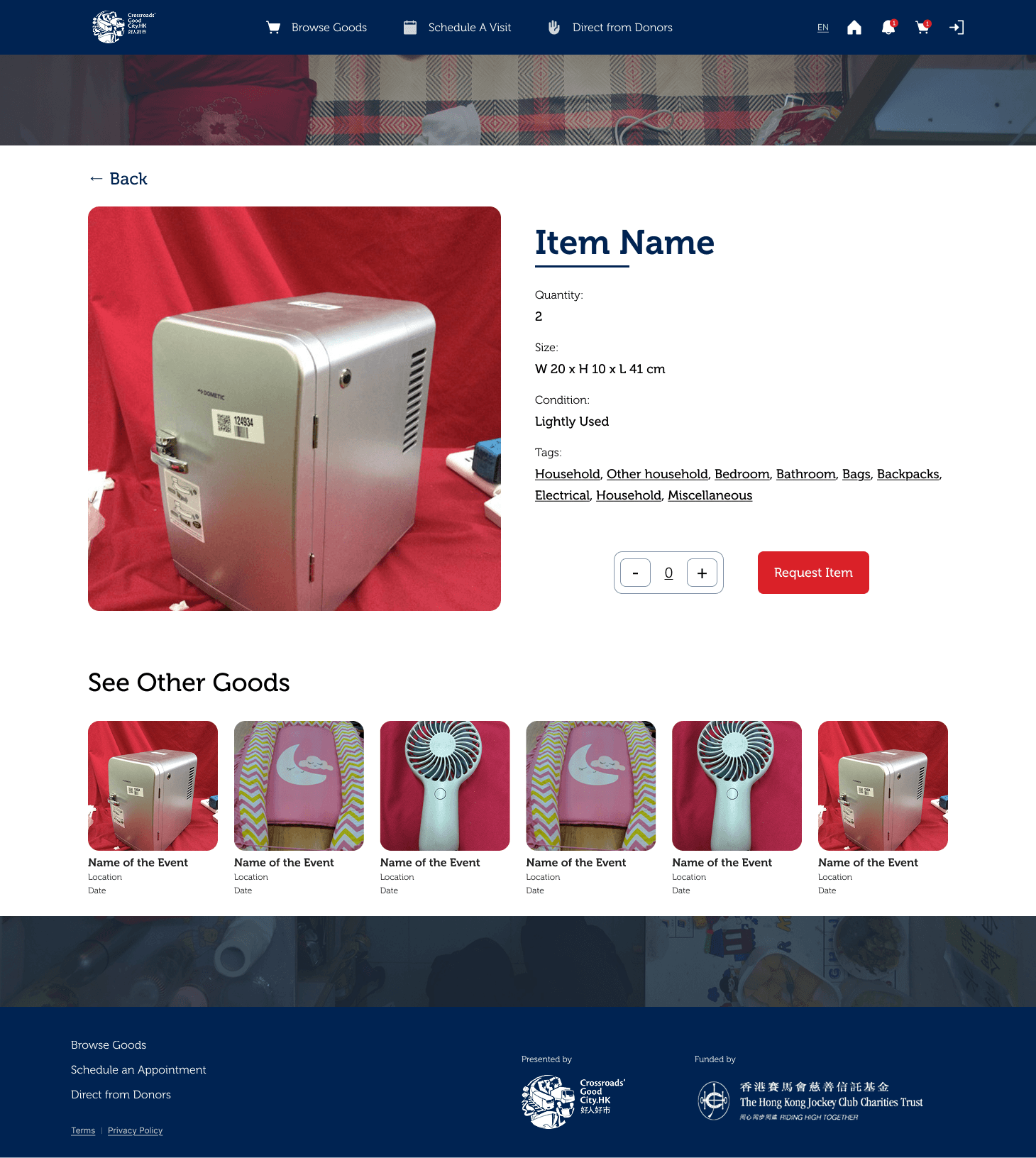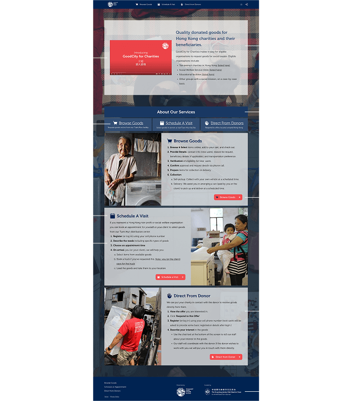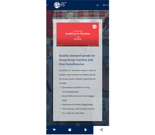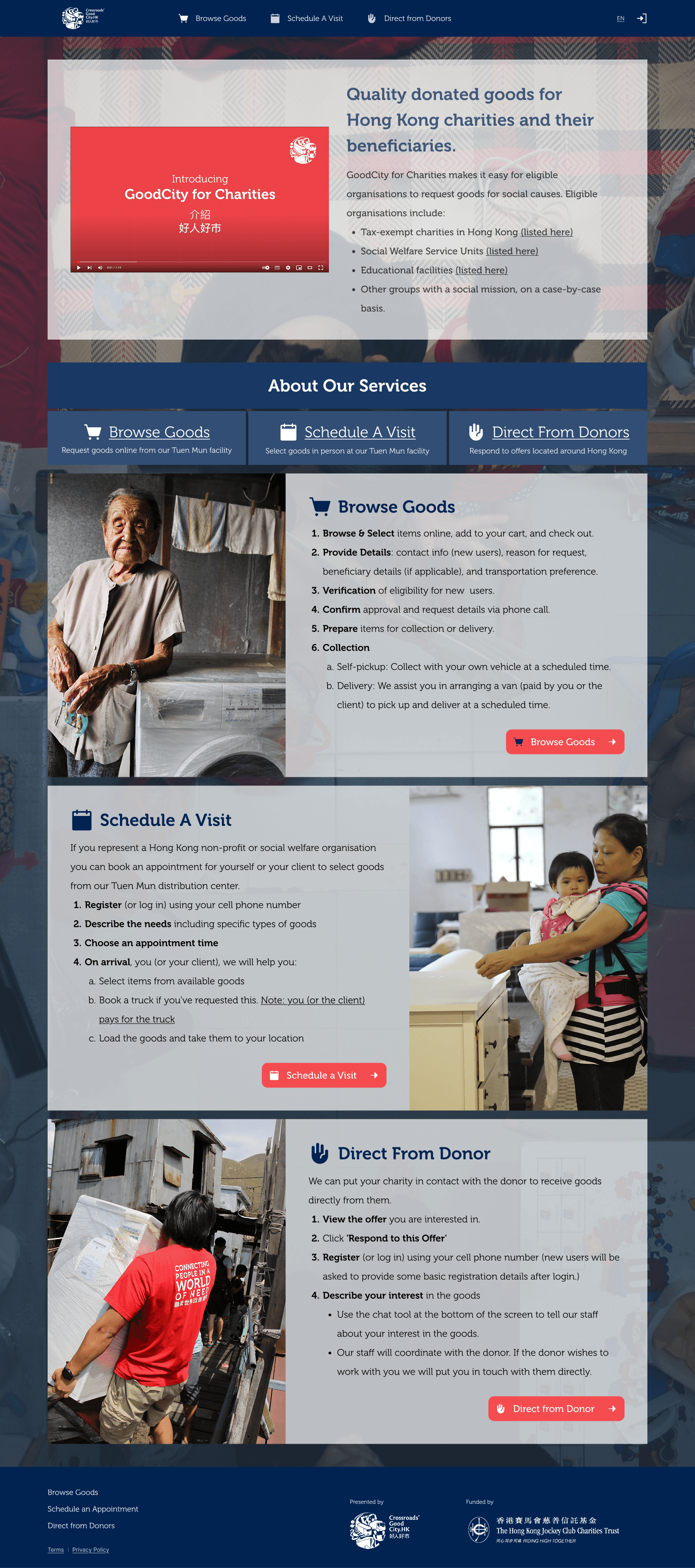 As part of the Global Distribution service, providing aid for relief and development both locally and internationally, Crossroads operates the GoodCity for Charities app, a client-facing platform that enables NGOs, schools, and case workers from the Social Welfare Department to browse and select goods to be delivered, book on-site browsing appointments, and utilize the "Direct from Donors" feature, which is currently under development.