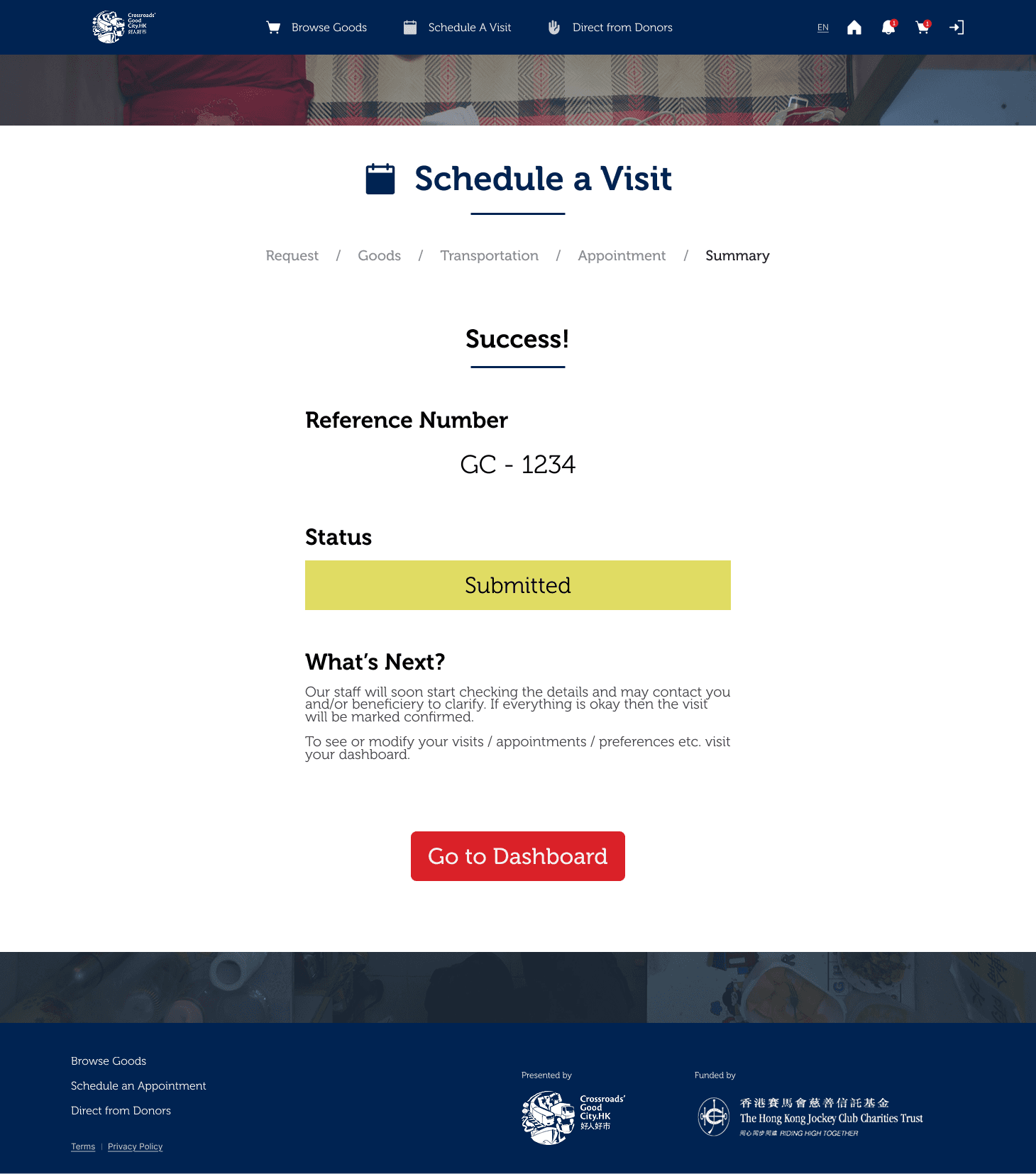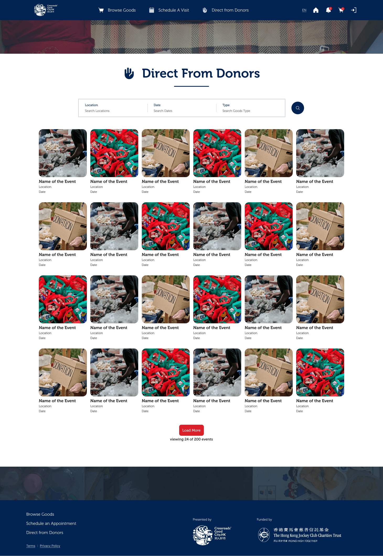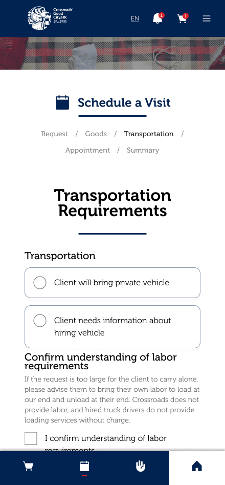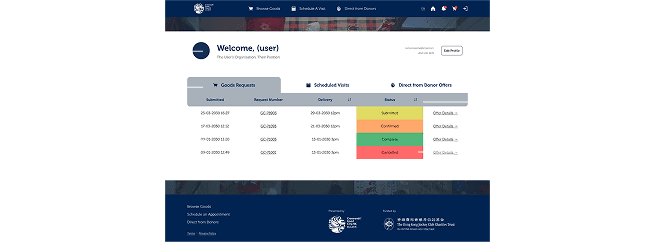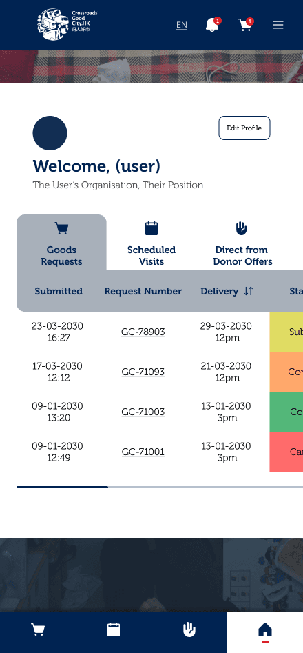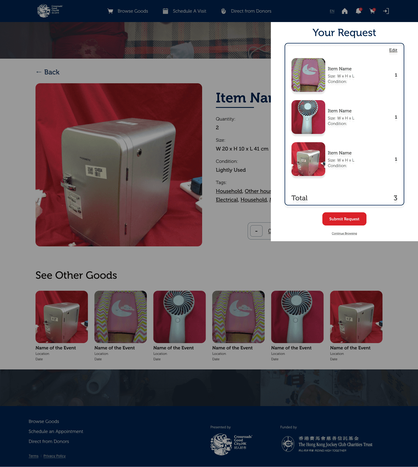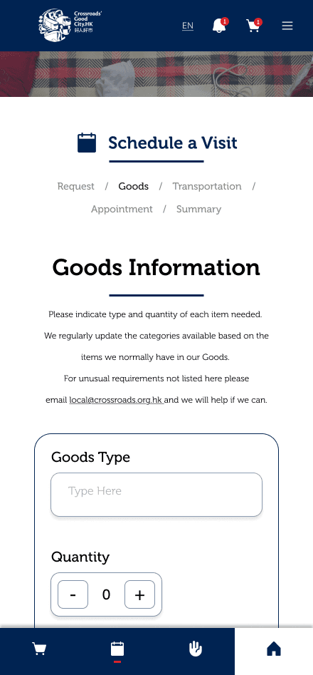 As part of the Global Distribution service, providing aid for relief and development both locally and internationally, Crossroads operates the GoodCity for Charities app, a client-facing platform that enables NGOs, schools, and case workers from the Social Welfare Department to browse and select goods to be delivered, book on-site browsing appointments, and utilize the "Direct from Donors" feature, which is currently under development.