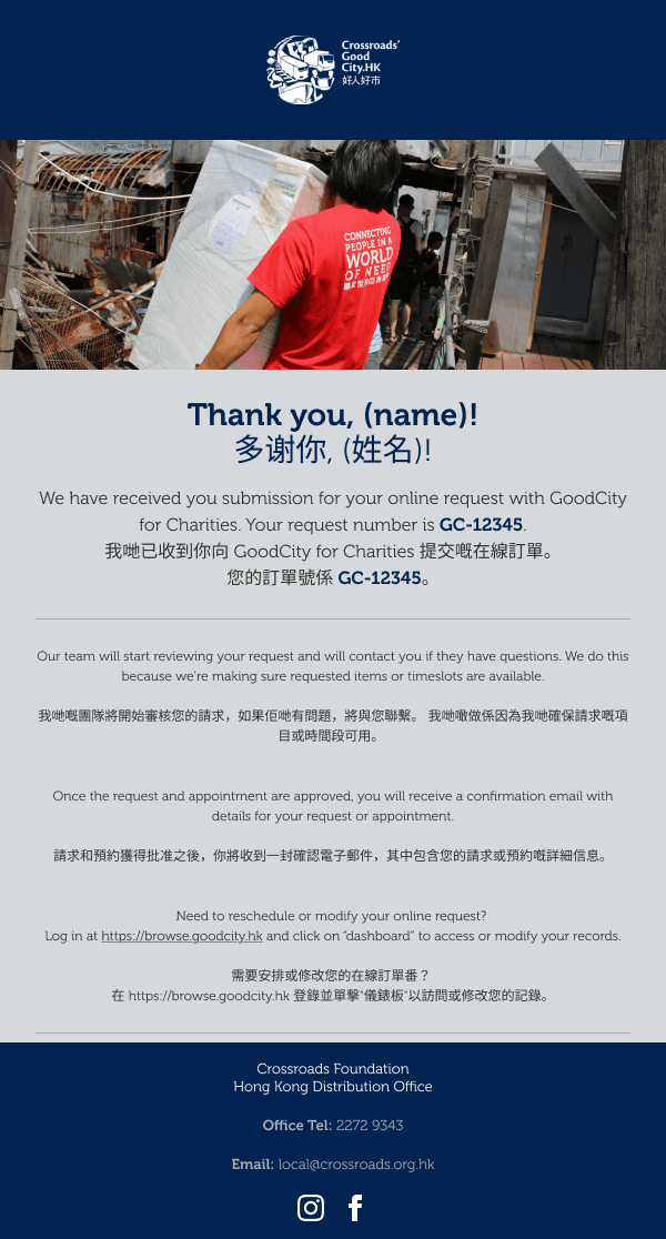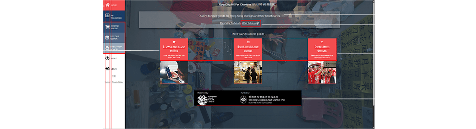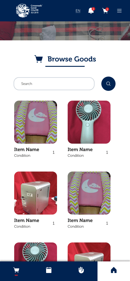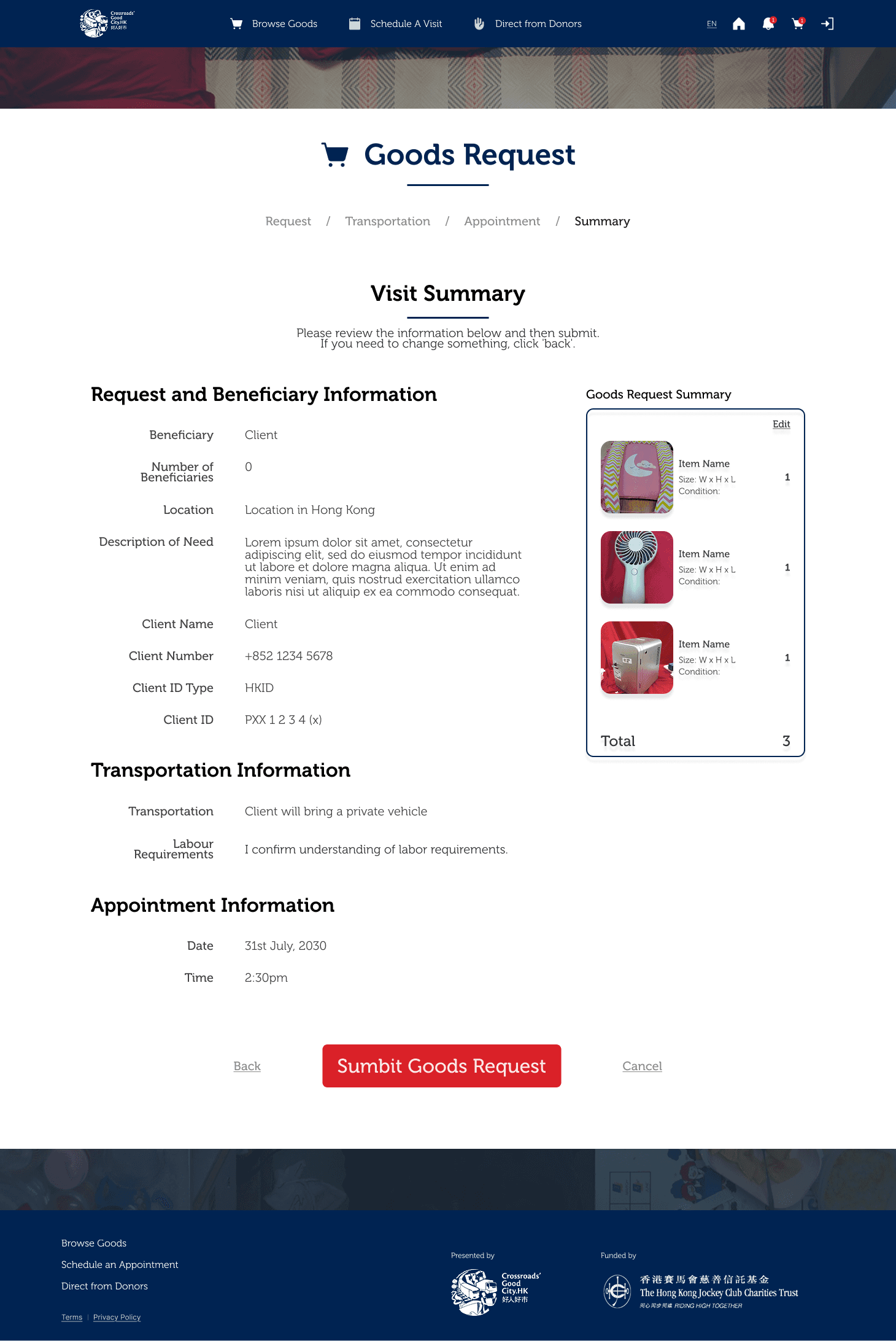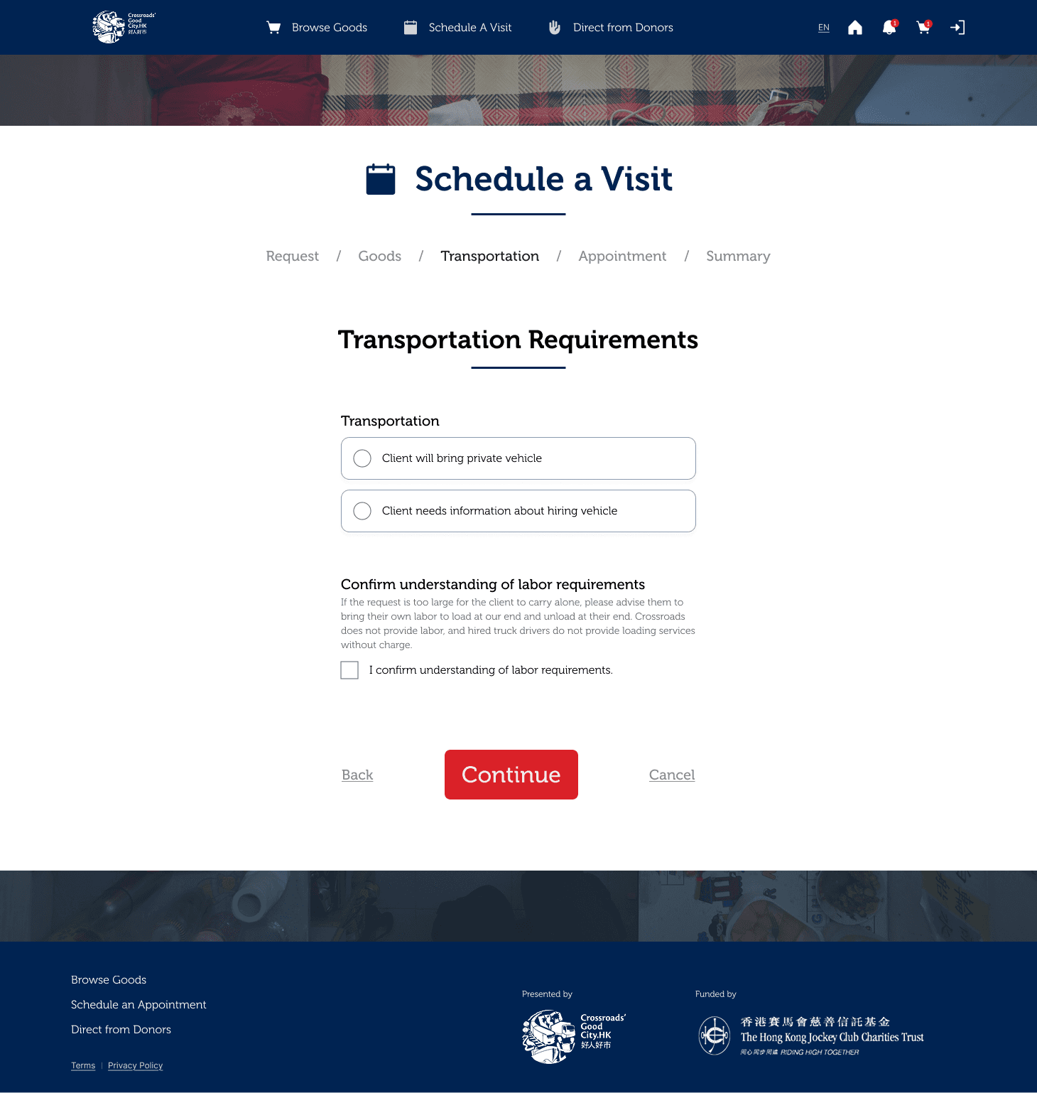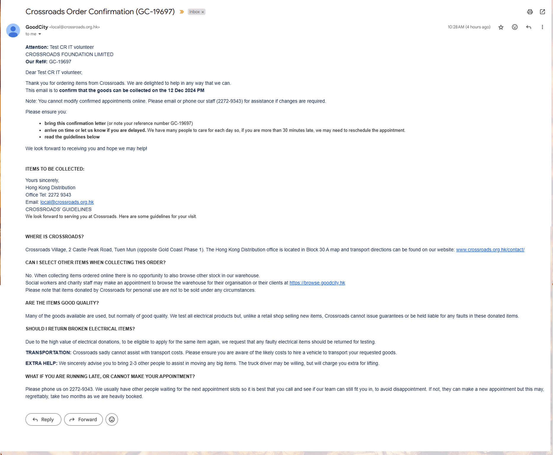 As part of the Global Distribution service, providing aid for relief and development both locally and internationally, Crossroads operates the GoodCity for Charities app, a client-facing platform that enables NGOs, schools, and case workers from the Social Welfare Department to browse and select goods to be delivered, book on-site browsing appointments, and utilize the "Direct from Donors" feature, which is currently under development.