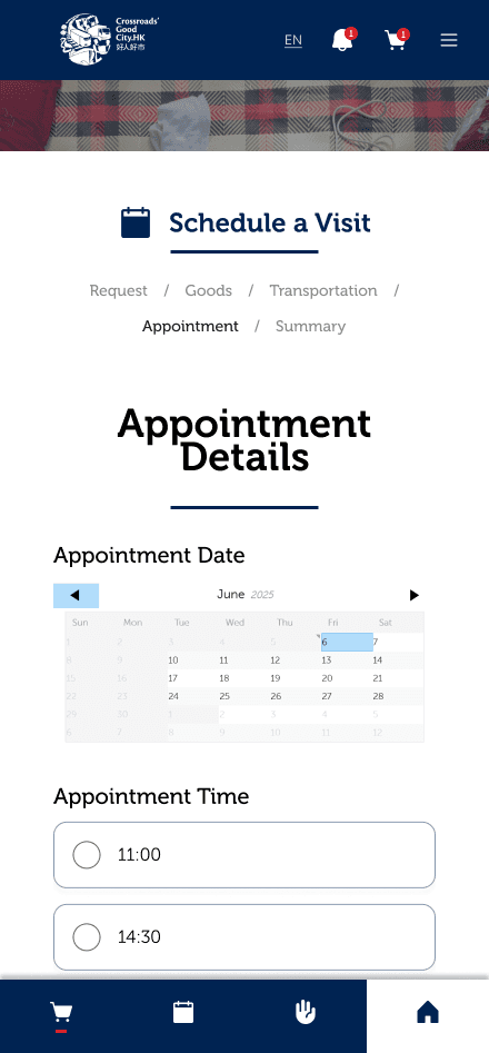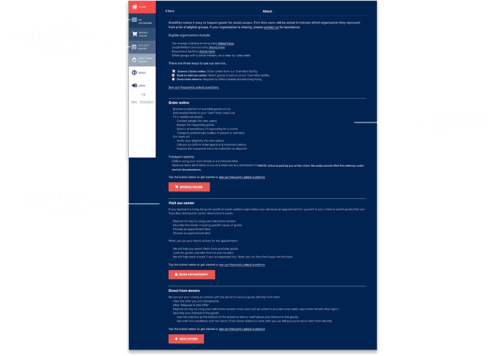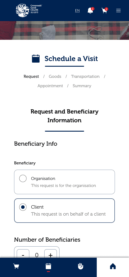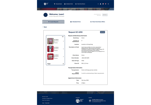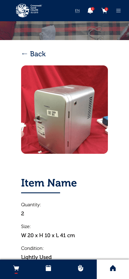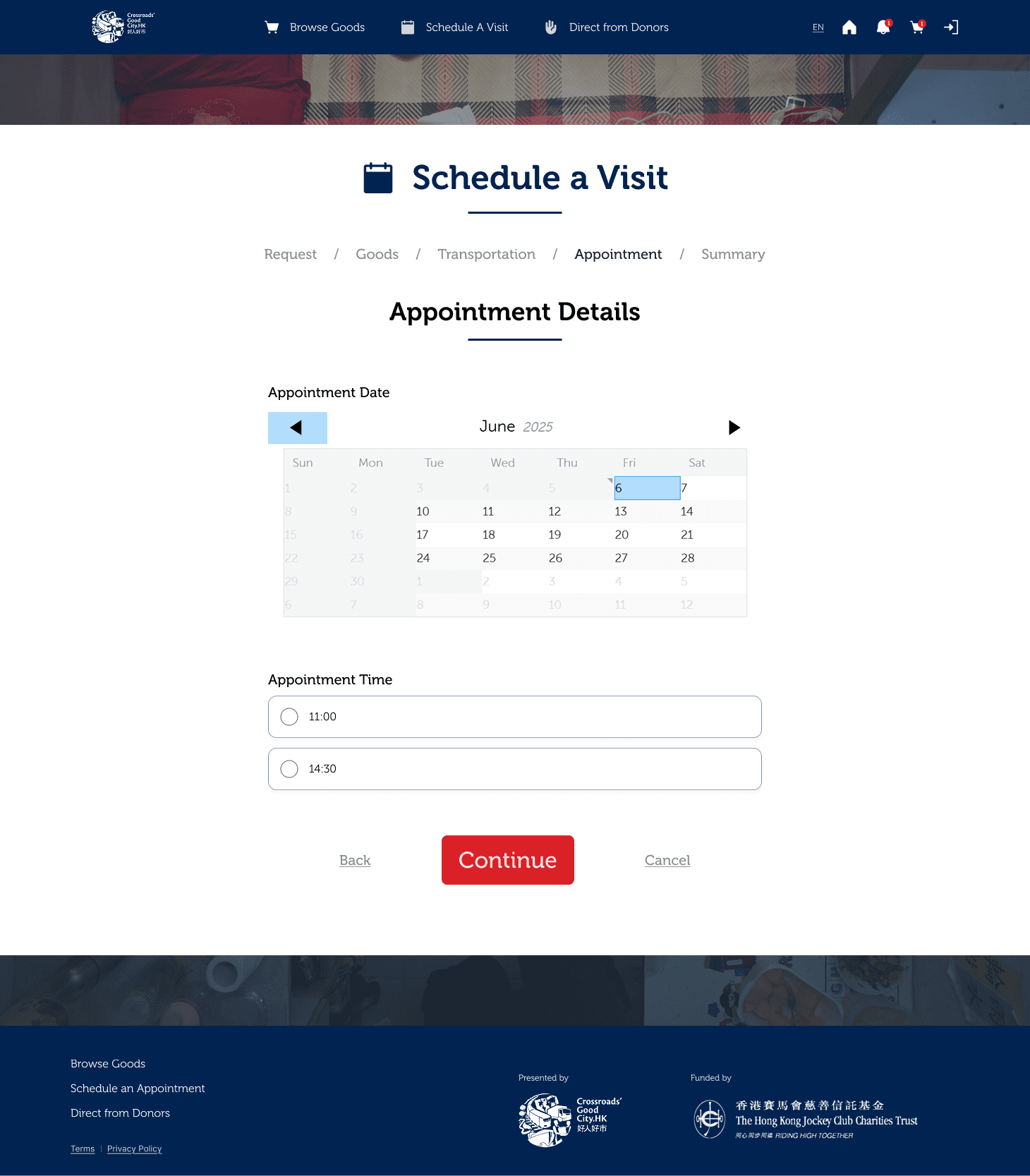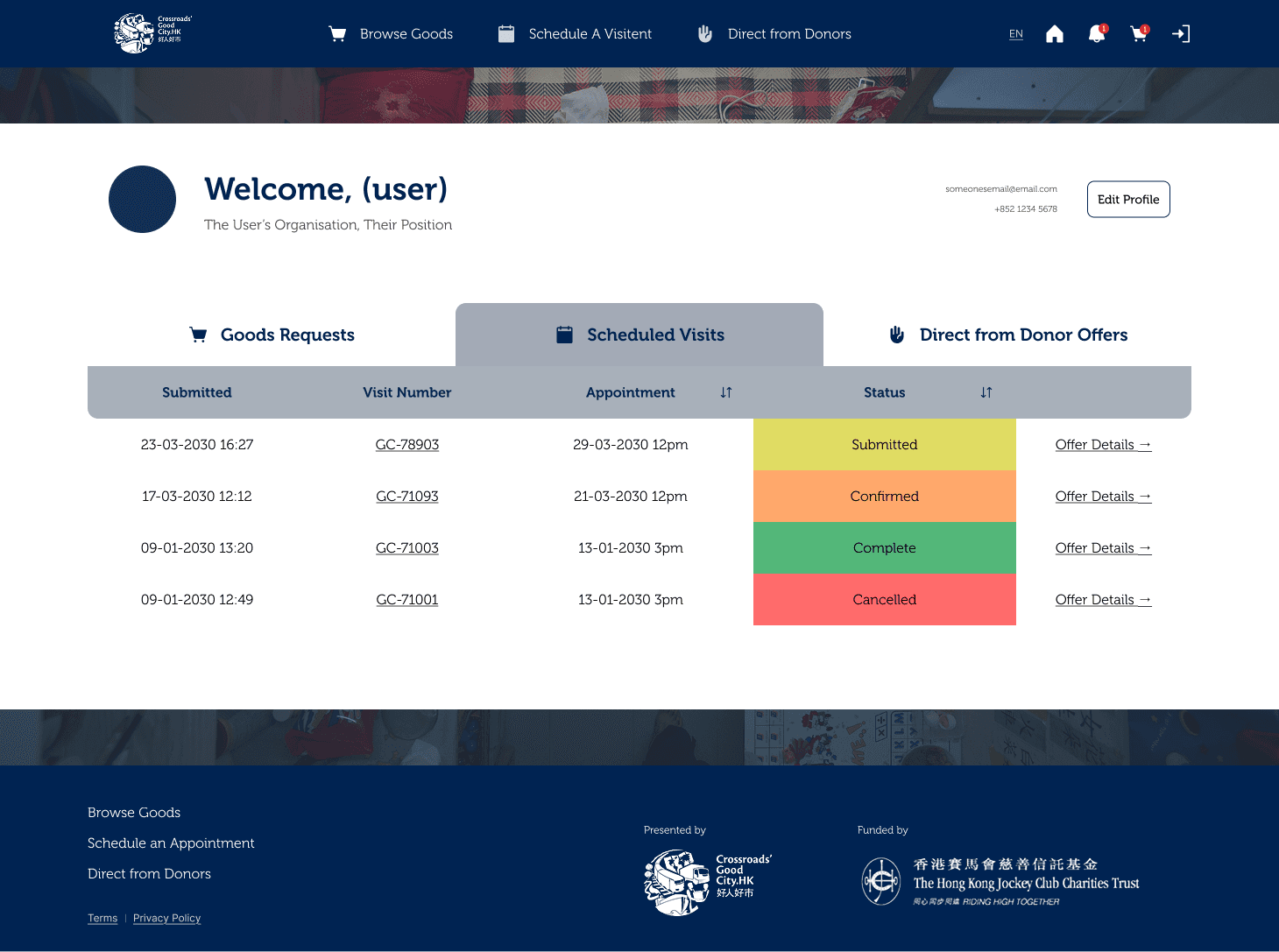 As part of the Global Distribution service, providing aid for relief and development both locally and internationally, Crossroads operates the GoodCity for Charities app, a client-facing platform that enables NGOs, schools, and case workers from the Social Welfare Department to browse and select goods to be delivered, book on-site browsing appointments, and utilize the "Direct from Donors" feature, which is currently under development.