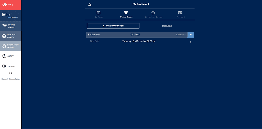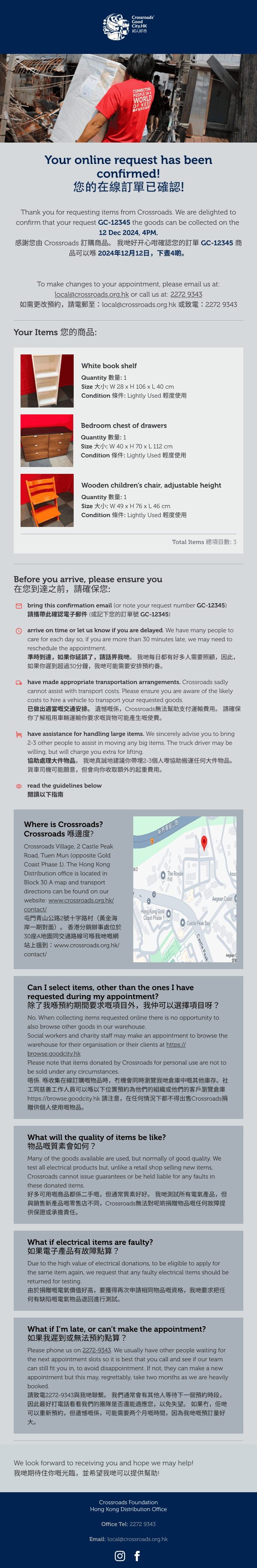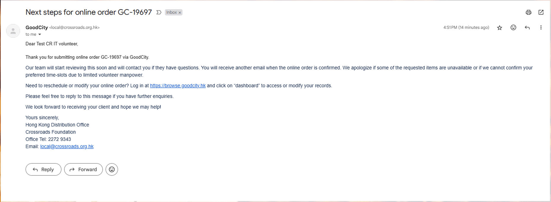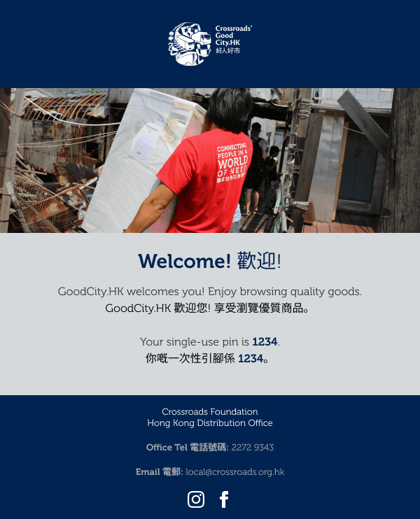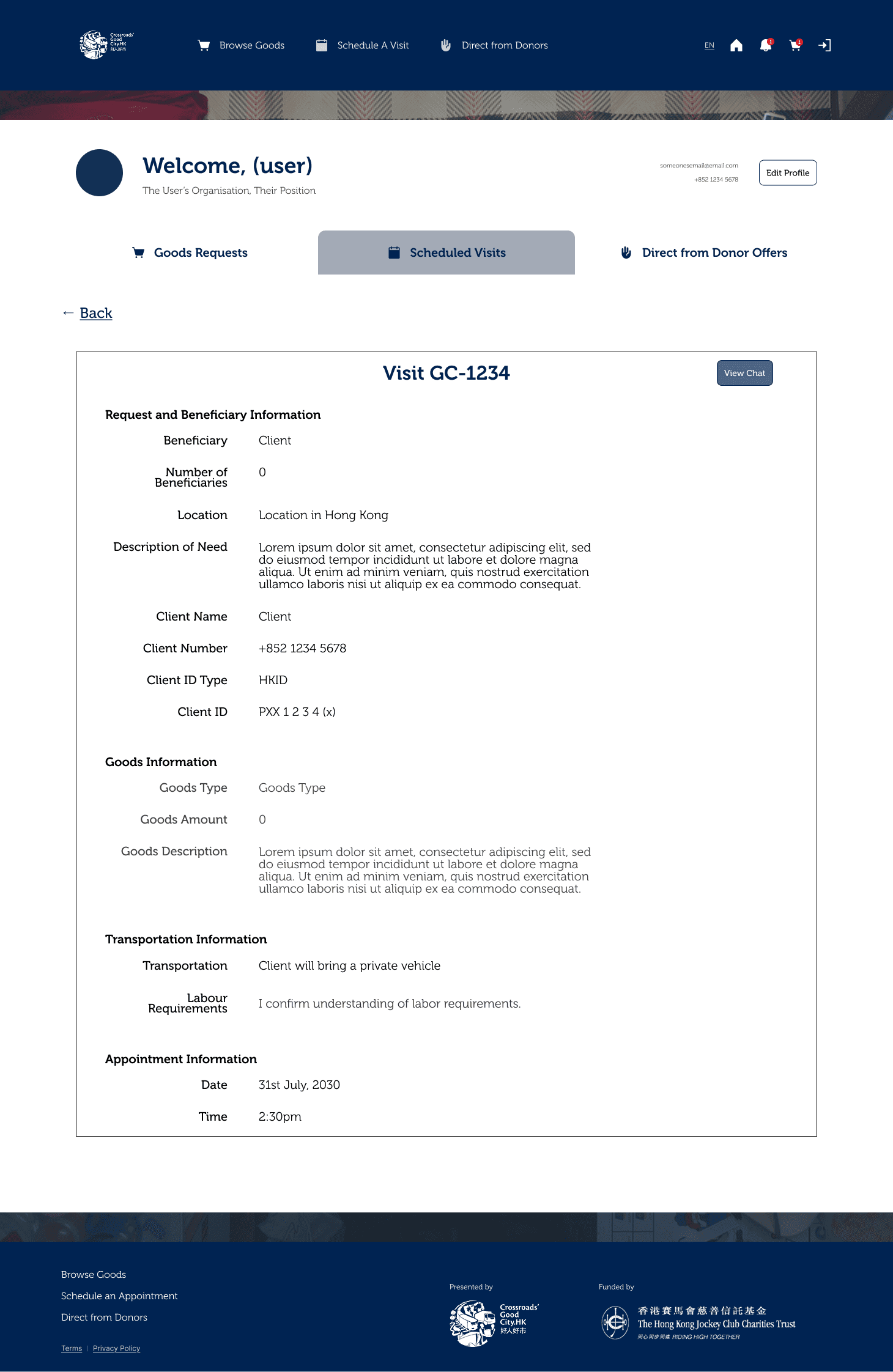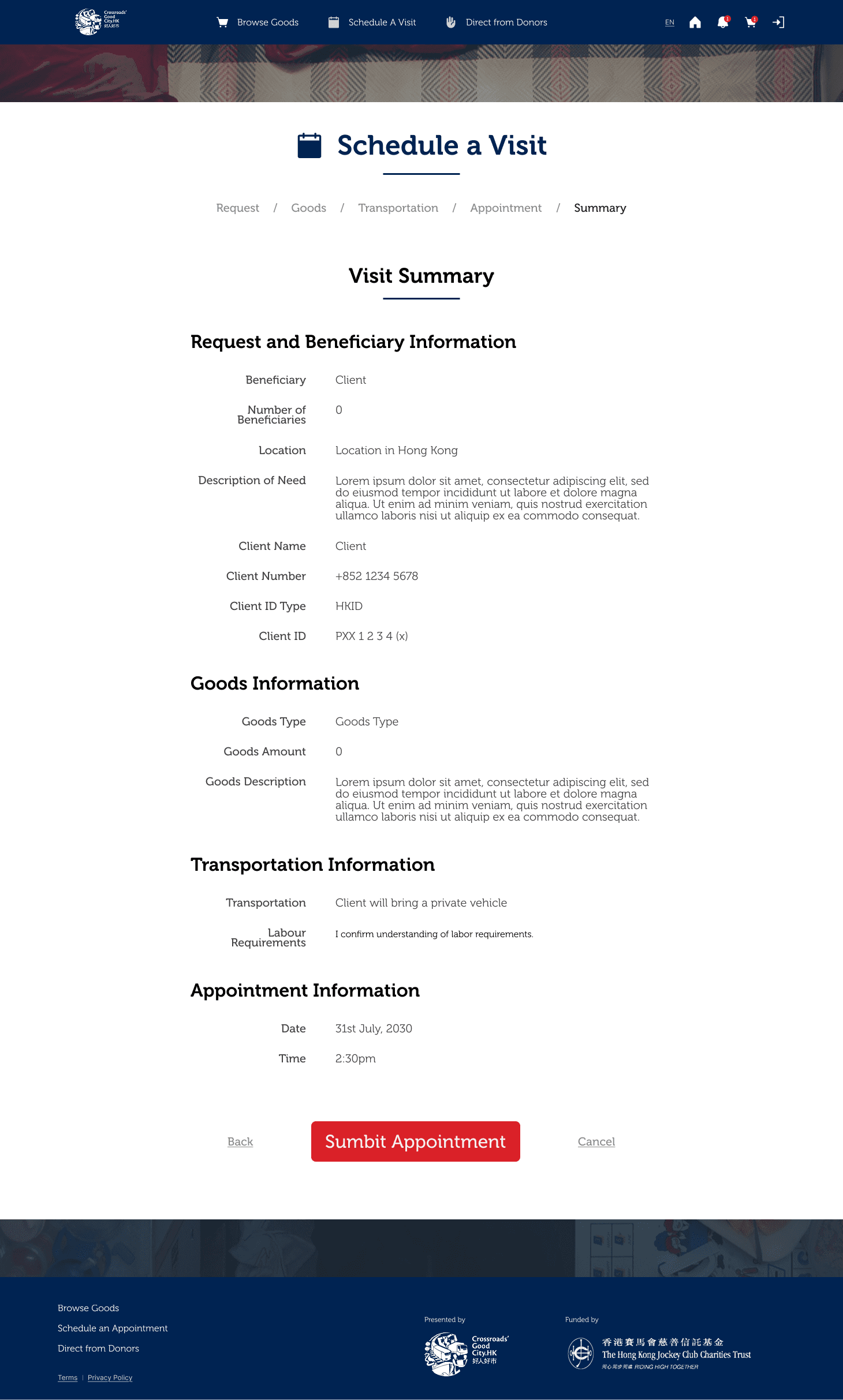 As part of the Global Distribution service, providing aid for relief and development both locally and internationally, Crossroads operates the GoodCity for Charities app, a client-facing platform that enables NGOs, schools, and case workers from the Social Welfare Department to browse and select goods to be delivered, book on-site browsing appointments, and utilize the "Direct from Donors" feature, which is currently under development.